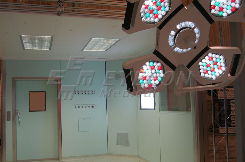 SHD (Sorima Hospital Development): Sala operatie cu pereti de camera curata, cu usa automata, culisanta din HPL laminat si tavan cu panouri din HPL laminat, sistem Flatline hermetic;