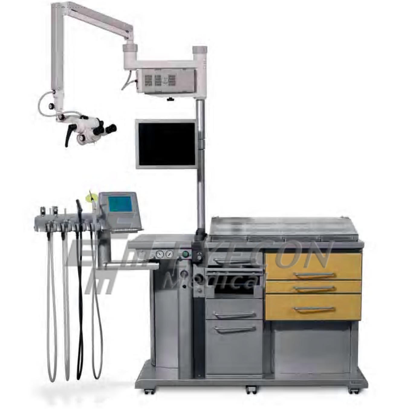Modul de control vacuum si modul de control pulverizare, 3 suporturi fixe pentru endoscoape, incalzitor de oglinzi laringiene, sistem chirurgical de aspiratie, furnizat cu o pompa de capacitate de 40 l/min, cu recipient pentru secretii si control vacuum pentru reglarea intensitatii aspiratiei.