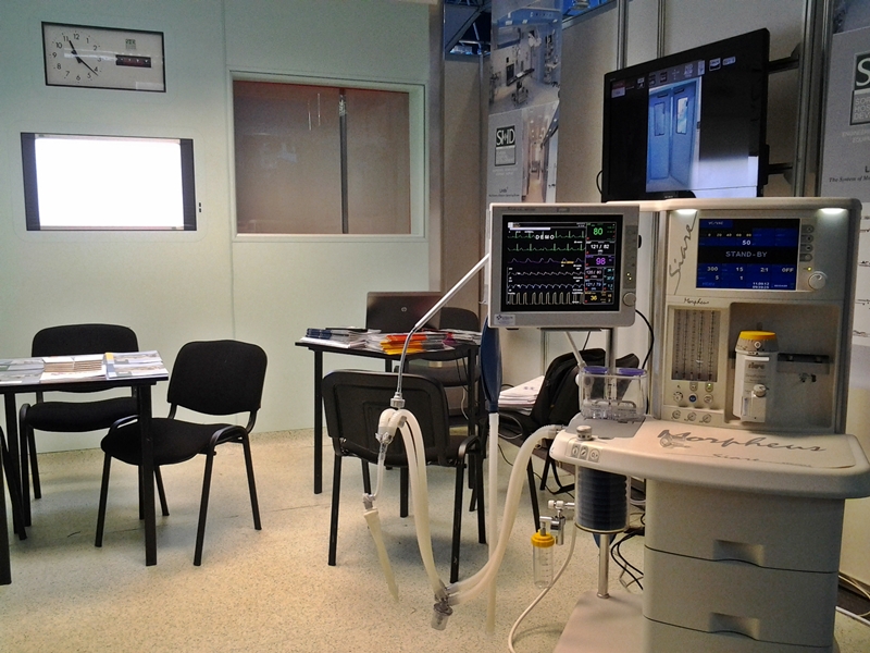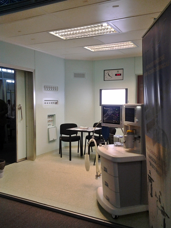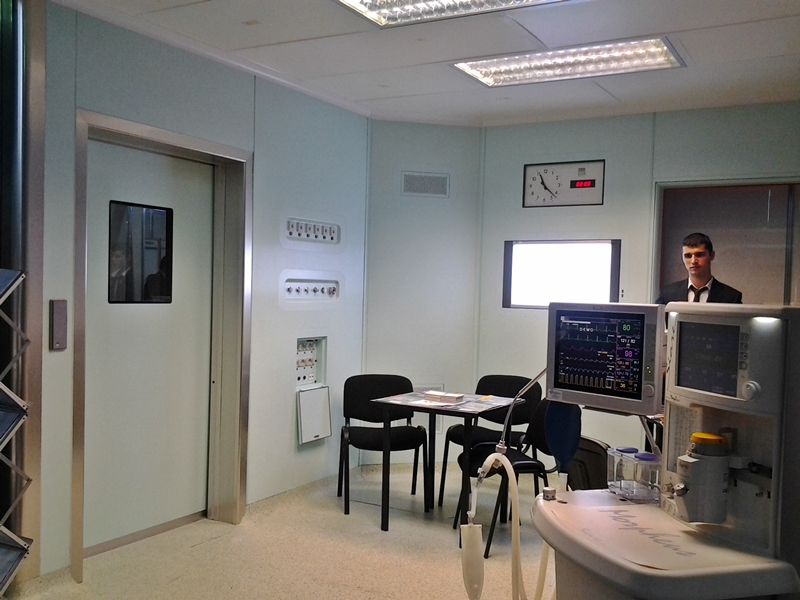 sala de operatie realizata cu pereti de camera curata din SHPL (HPL Stratificat), montati pe structura independenta, prevazuta cu usa automata culisanta placata cu HPL, tavan realizat din HPL si prevazuta cu accesorii integrate la suprafata cum ar fi ceas analogic si digital, monitor LCD 32", negatoscop, panouri pentru prize de gaze medicale si curent electric, sistem Flatline hermetic (SHD – Italia);