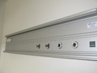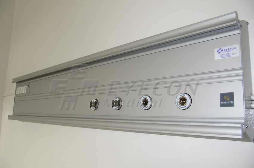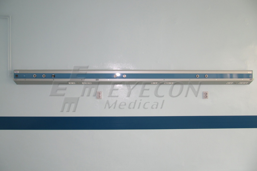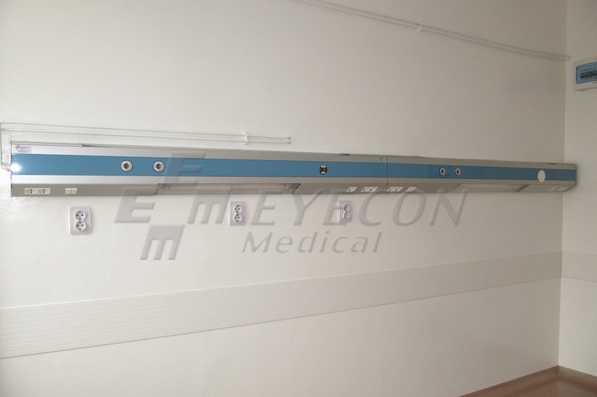 Console de gaze si fluide medicale, pentru saloanele de nou-nascuti, prevazute cu prize de O2 si aer comprimat, prize de 220V, lampi de iluminare directa si indirecta, sina eurorail pentru accesorii si seturi oxigenator;