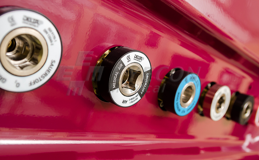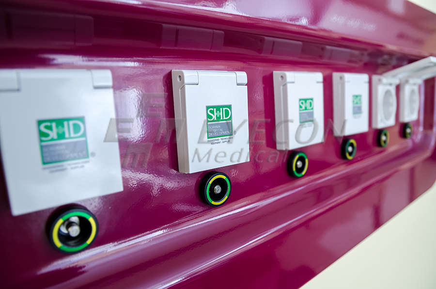 - Consola cu montaj suspendat in tavan, tip "Media-Bridge", cu trei laturi, avand incluse: prize oxigen, prize aer comprimat medical, prize vacuum, prize N2O, prize pentru evacuarea gazelor anestezice, prize electrice, prize voce/date, troliu culisant suspendat, prevazut cu 4 rafturi, corturi rotabile pentru a permite culisarea troliului pe toate laturile.